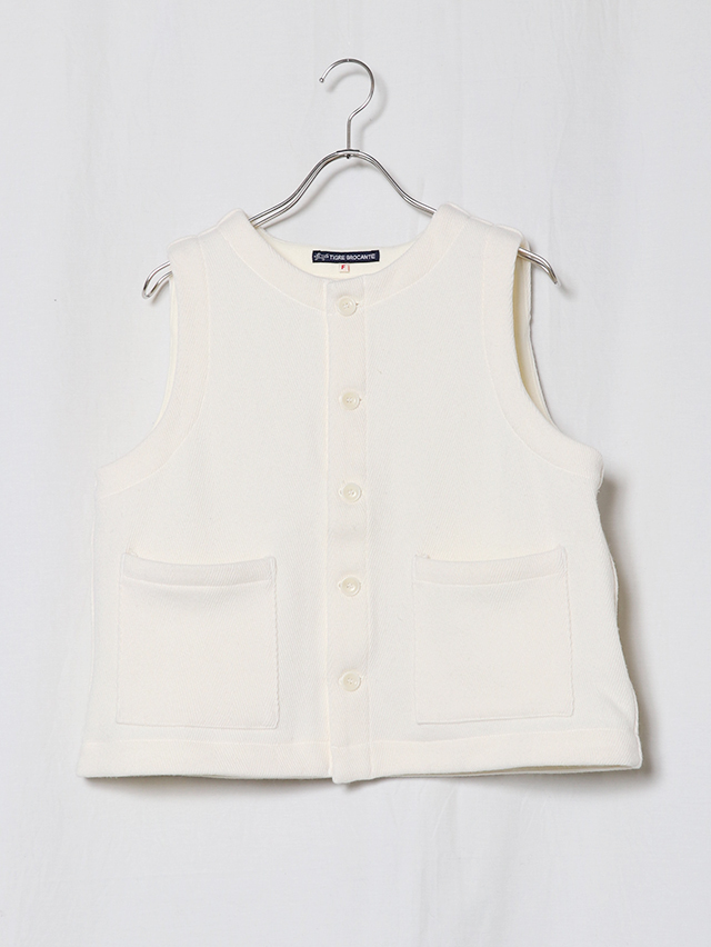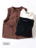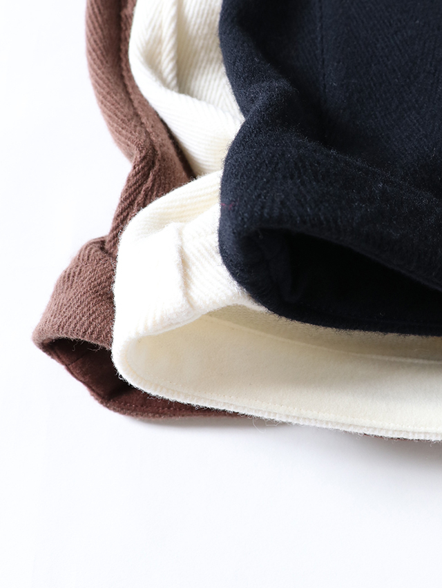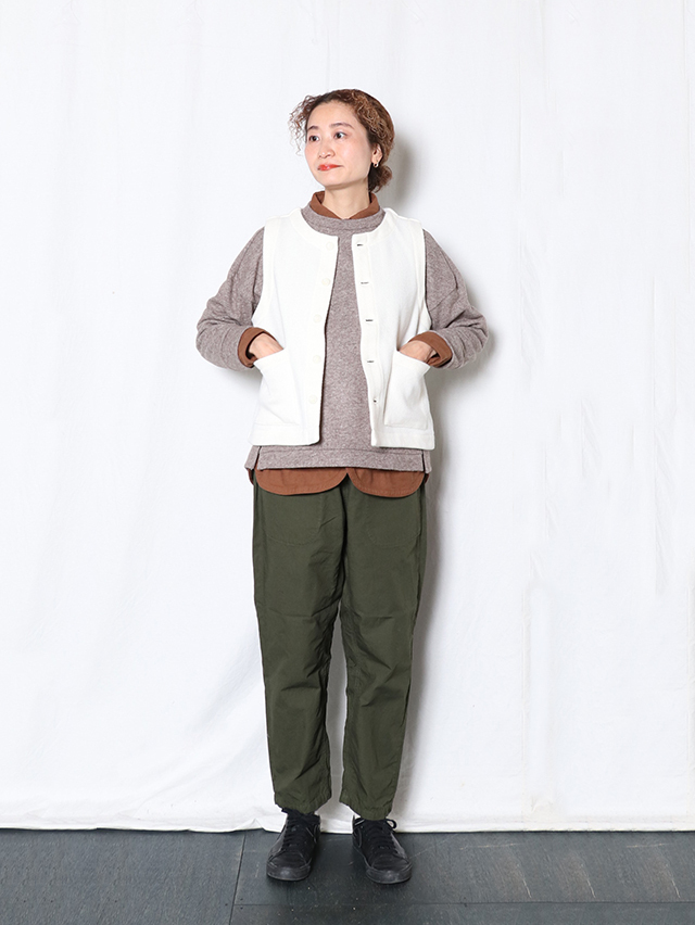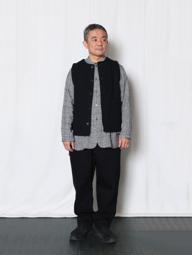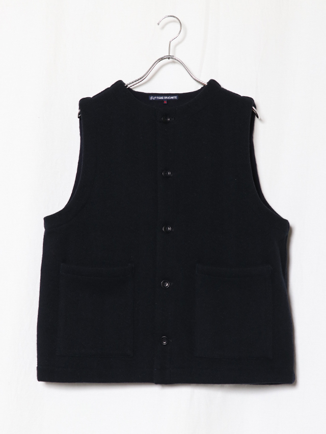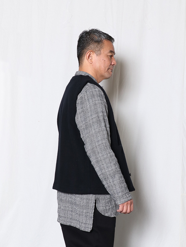 厚みのある暖かなカルゼヘリンボン素材。形はシンプルなクルーネック、前開きタイプのベストを仕立てました。襟付きのインナーを合わせたり、シンプルなカットソーと合わせやすい形、秋冬のコーディネートにプラスして、ぜひお楽しみください。