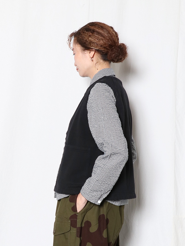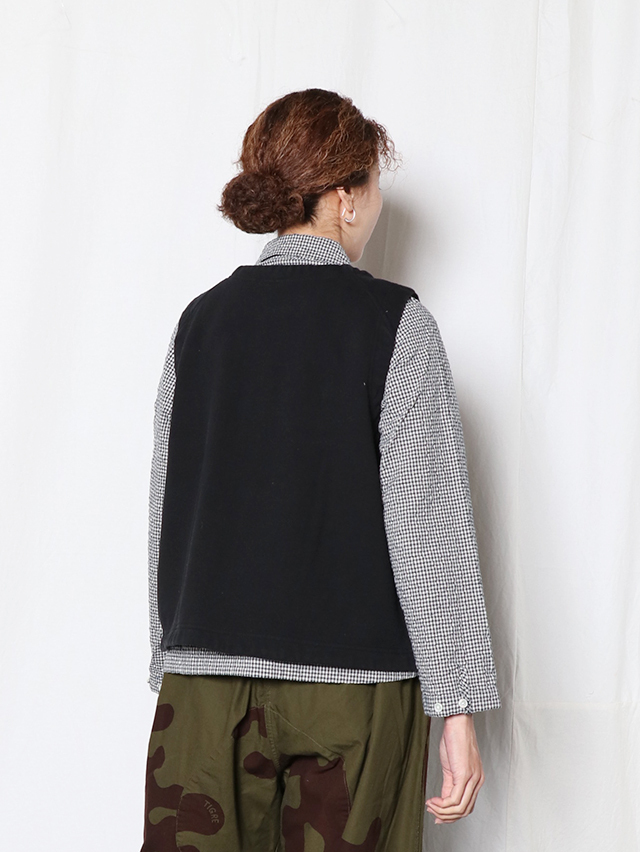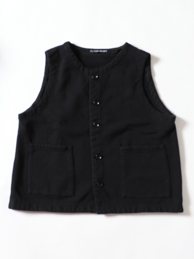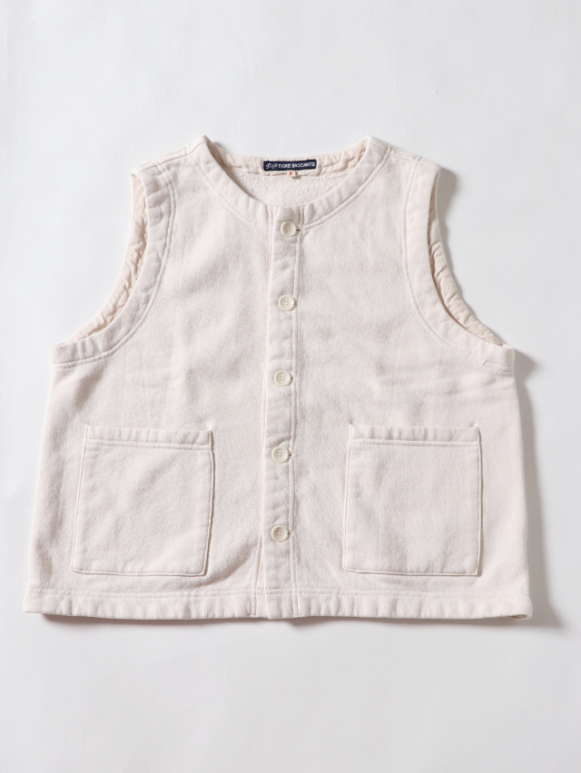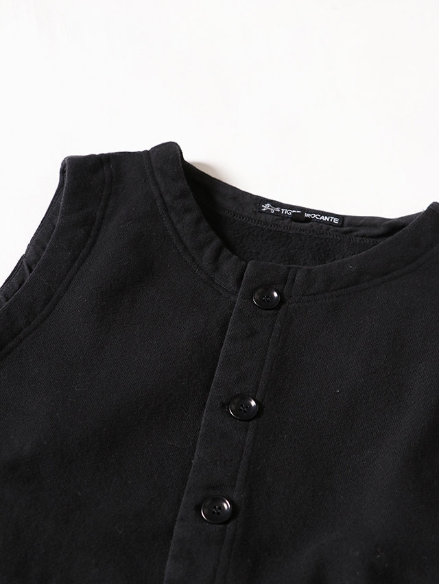 シンプルなクルーネックの前開きベスト。60年代古着の裏毛、古着特有の起毛感を再現したオリジナルの素材でご用意しました。インナーを選ばず使えて、ジャケットなどとの合わせにもおすすめな一着です。