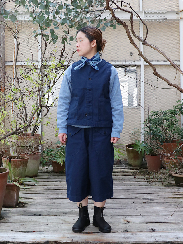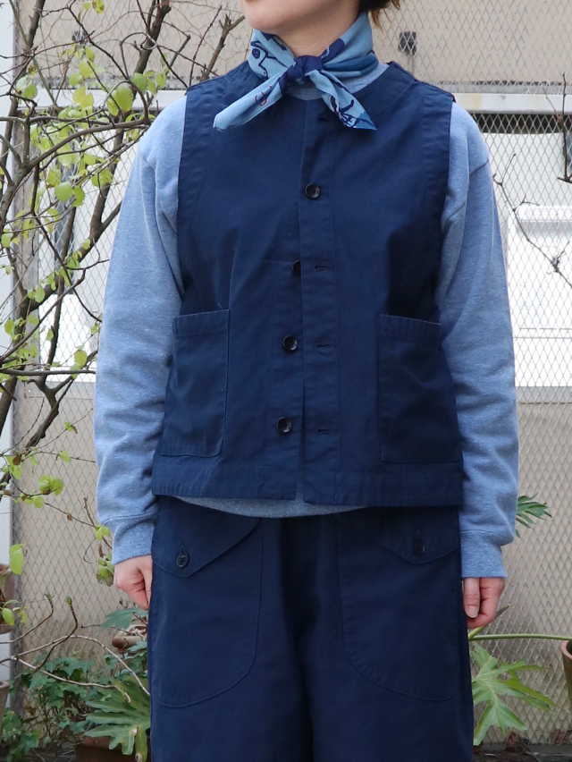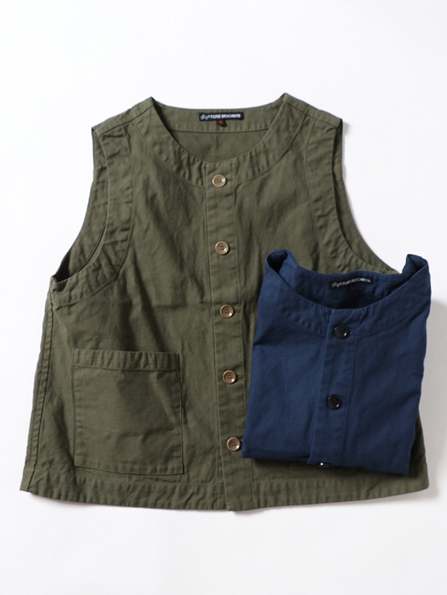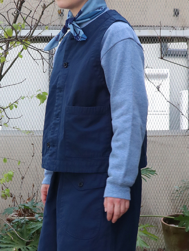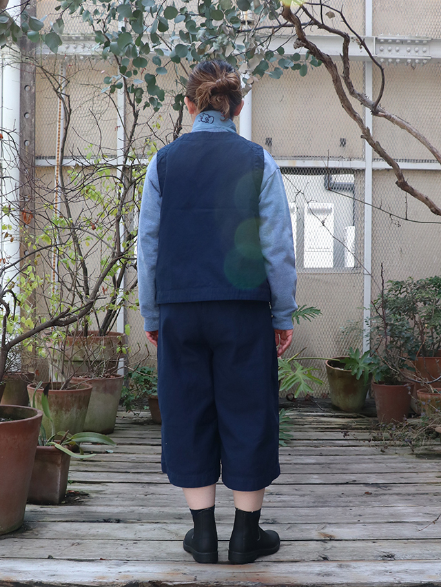 シンプルなクルーネックの前開きベスト。生地は落ち着いたつや感のあるバックサテン素材でご用意しました。インナーを選ばず使えて、ジャケットなどとの合わせにもおすすめな一着です。