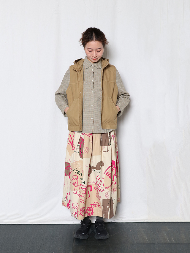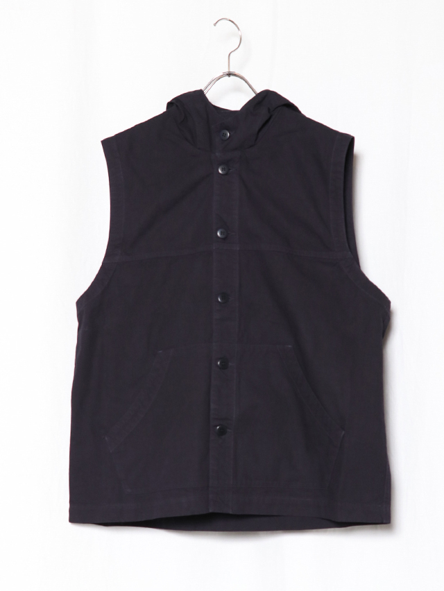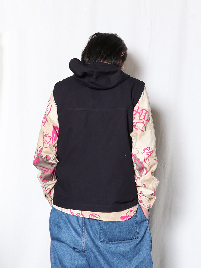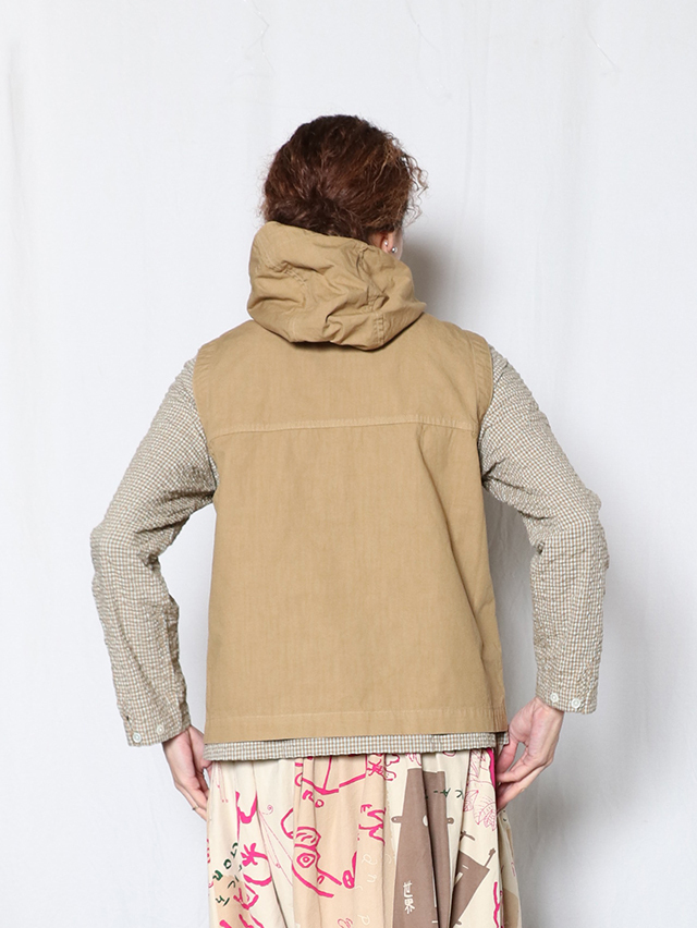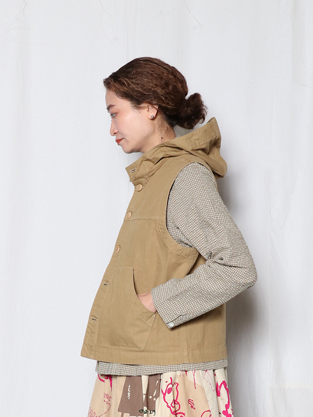お馴染みのジンバブエコットンを使用した、フード付きのベスト。形は切り替えが入り、ポケットが付いた前開きタイプのベストを仕立てました。コーディネートにプラスしてぜひお楽しみください。
